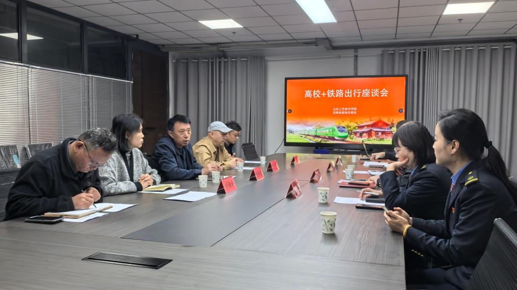 2025年10月10日,艺术与设计实践教学中心联合济南铁路局济南站,召开“高校+铁路出行”专题座谈会,旨在为我校师生校外写生、专业考察搭建安全、高效、经济的便捷出行通道。济南站站长杨素鹏、济南西站站长房家锐、济南西站副站长韩煜、济南站客运科科长楚景荣出席会议。实践教学中心主任高振堂主持会议,造型艺术学院院长刘宁、现代手工艺术学院副院长惠岩、实践教学中心办公室主任刘婧婧共同参会。